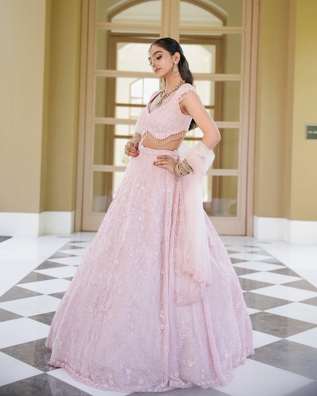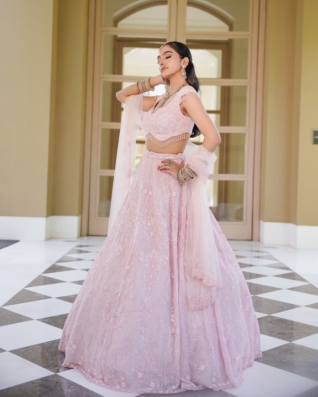 A delicate blush pink lehenga adorned with bright pink sequins and crystal work, adding sparkle and vibrancy to the soft base color. The combination of soft blush and bright accents creates a lively yet elegant look, perfect for weddings, receptions, and festive celebrations.