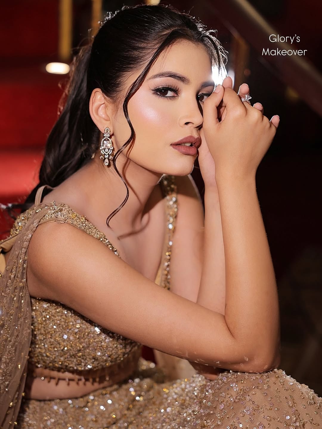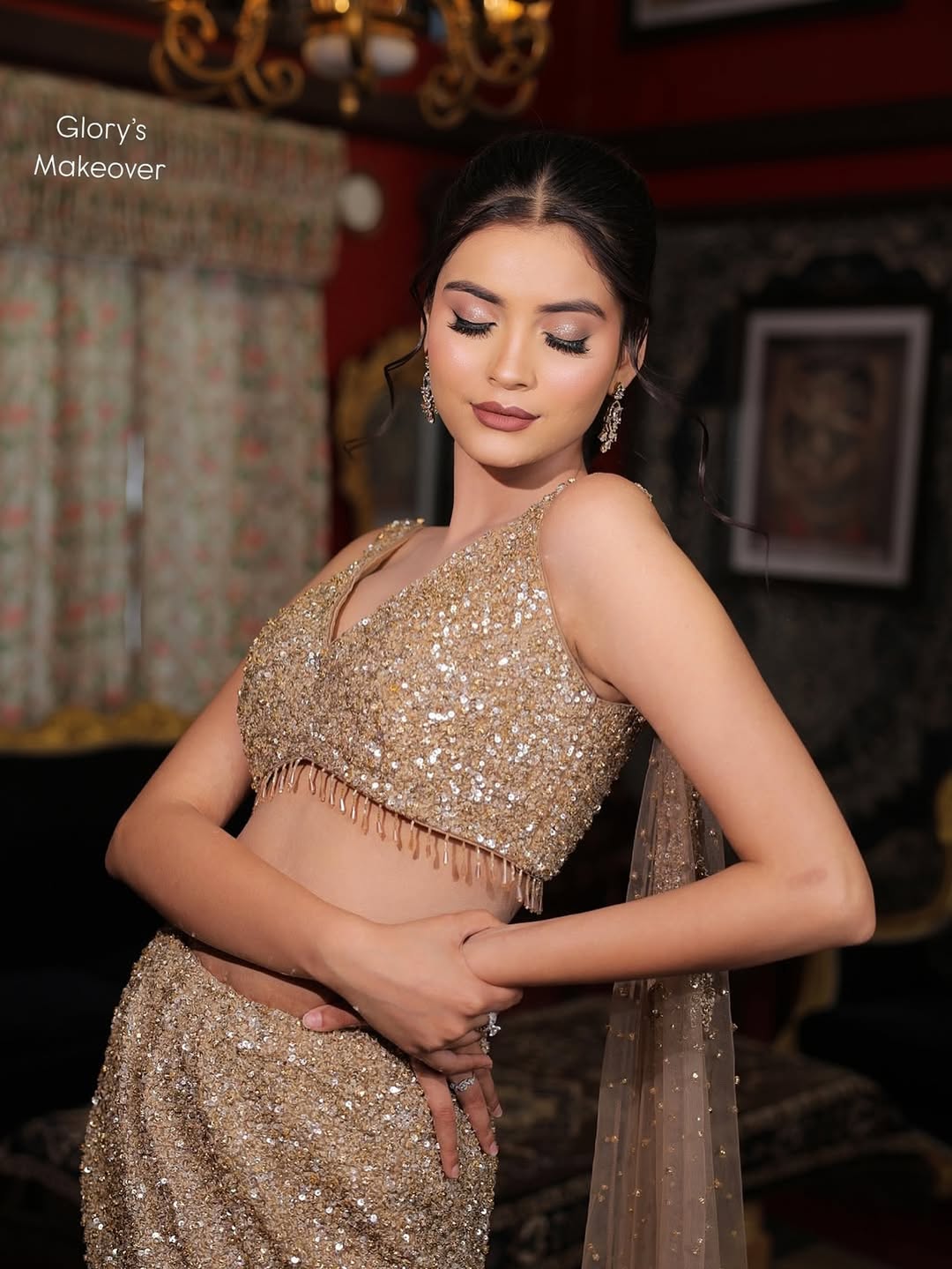 A luxurious champagne mermaid lehenga adorned with gold crystal embroidery all over, giving the outfit a radiant shimmer and a sophisticated finish. The warm champagne tone paired with gold accents creates a regal and festive look, perfect for weddings, receptions, and special occasions.