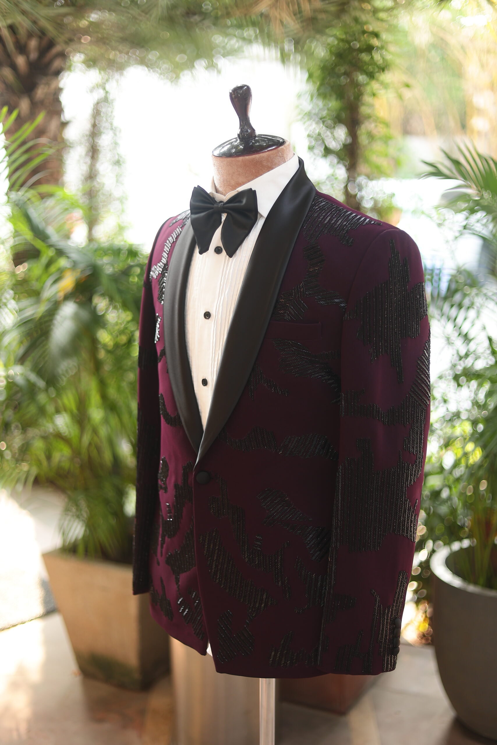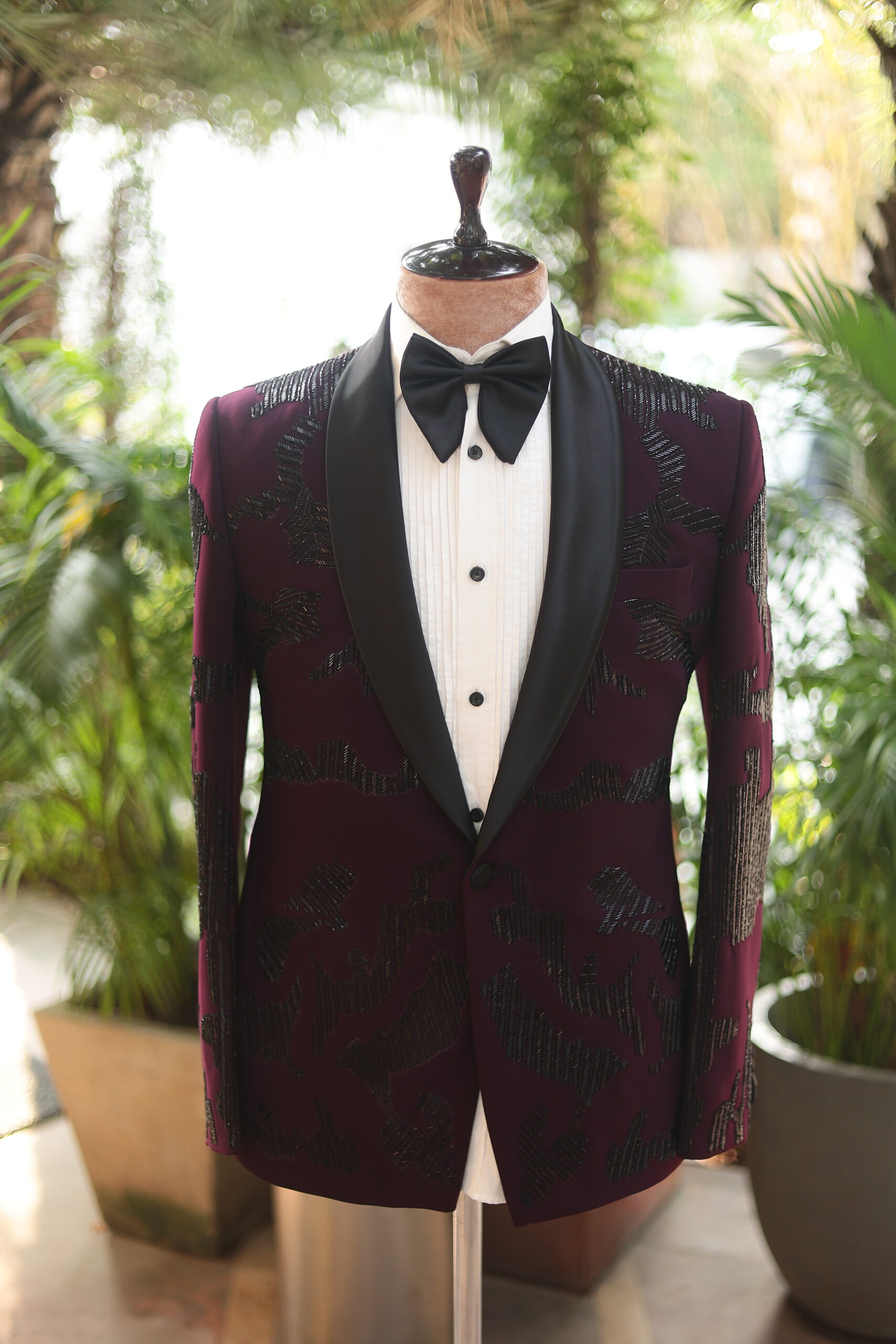 This is a complete tuxedo set, including the jacket, trousers, shirt, tux belt, and bow tie. The fabric offers a smooth fall and comfortable wear, while the beaded work adds texture and character to the outfit without feeling heavy.