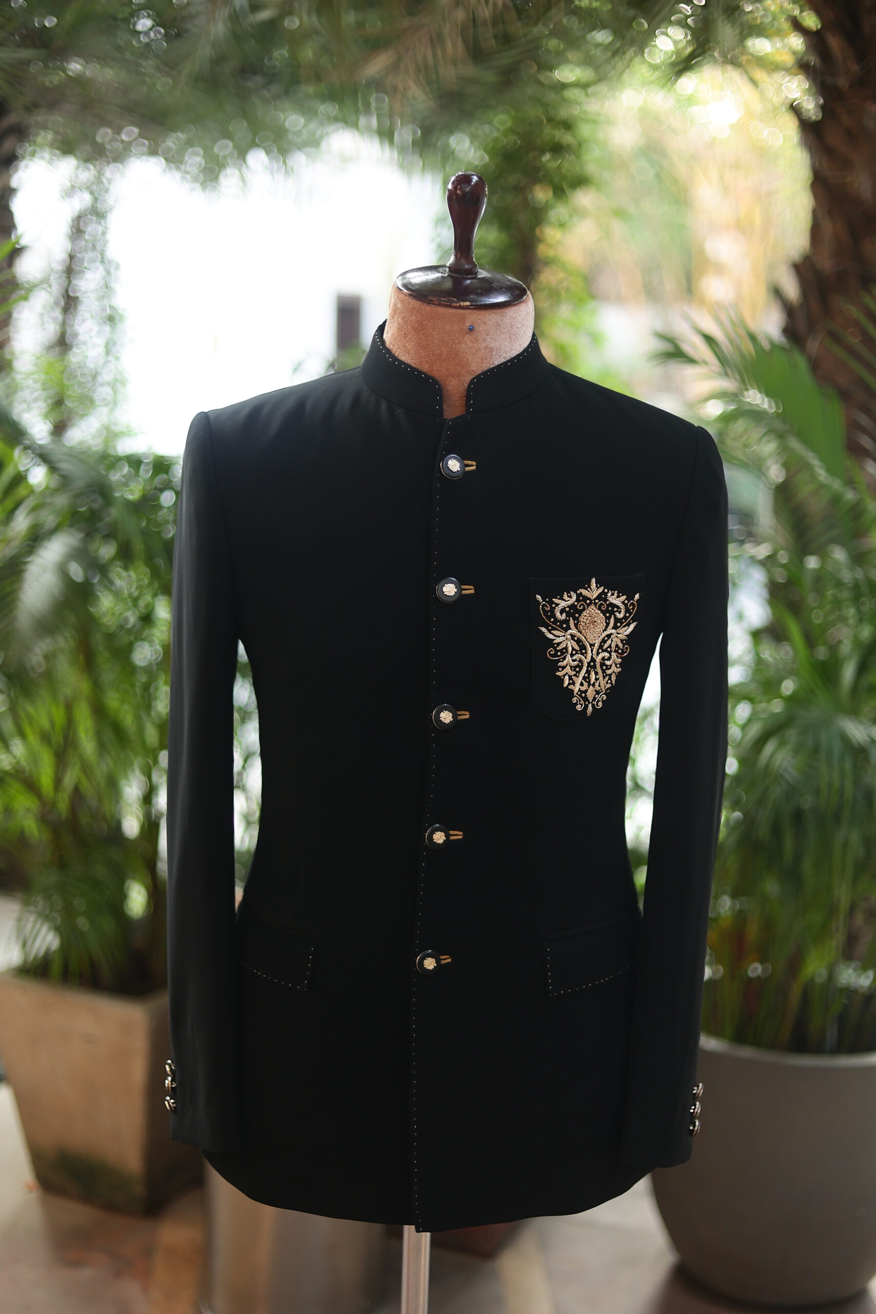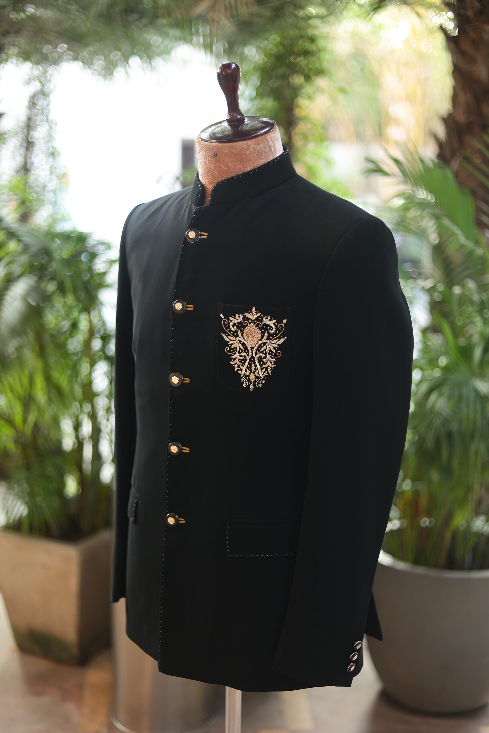 A refined black Indo-Western bandhgala full set detailed with dabka embroidery, adding depth and texture to the classic silhouette. The embroidery is done in a balanced manner, enhancing the outfit without overpowering its clean structure.