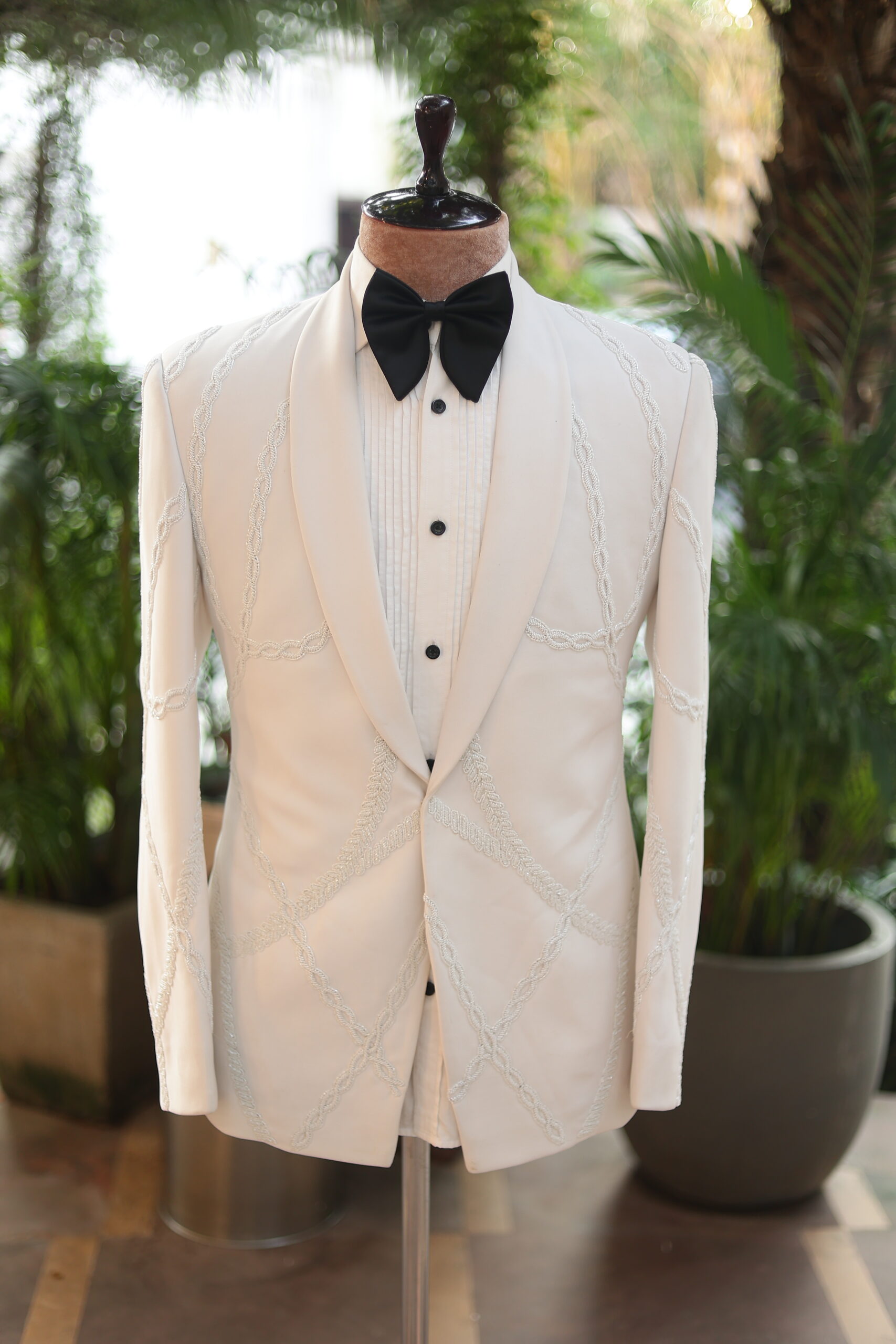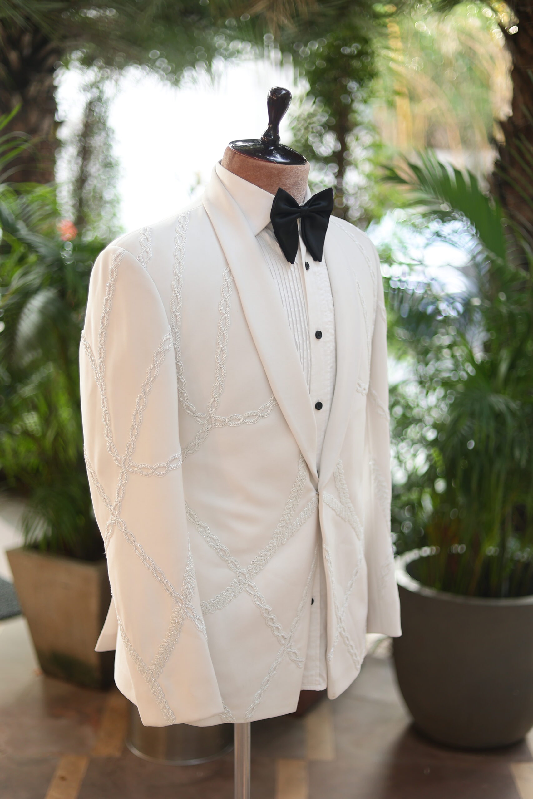 A refined white tuxedo for men detailed with white beaded work, offering a subtle textured finish while maintaining a clean and sophisticated look. Paired with a white shirt, black trousers, tux belt, and bow tie, the contrast keeps the ensemble sharp and well balanced.