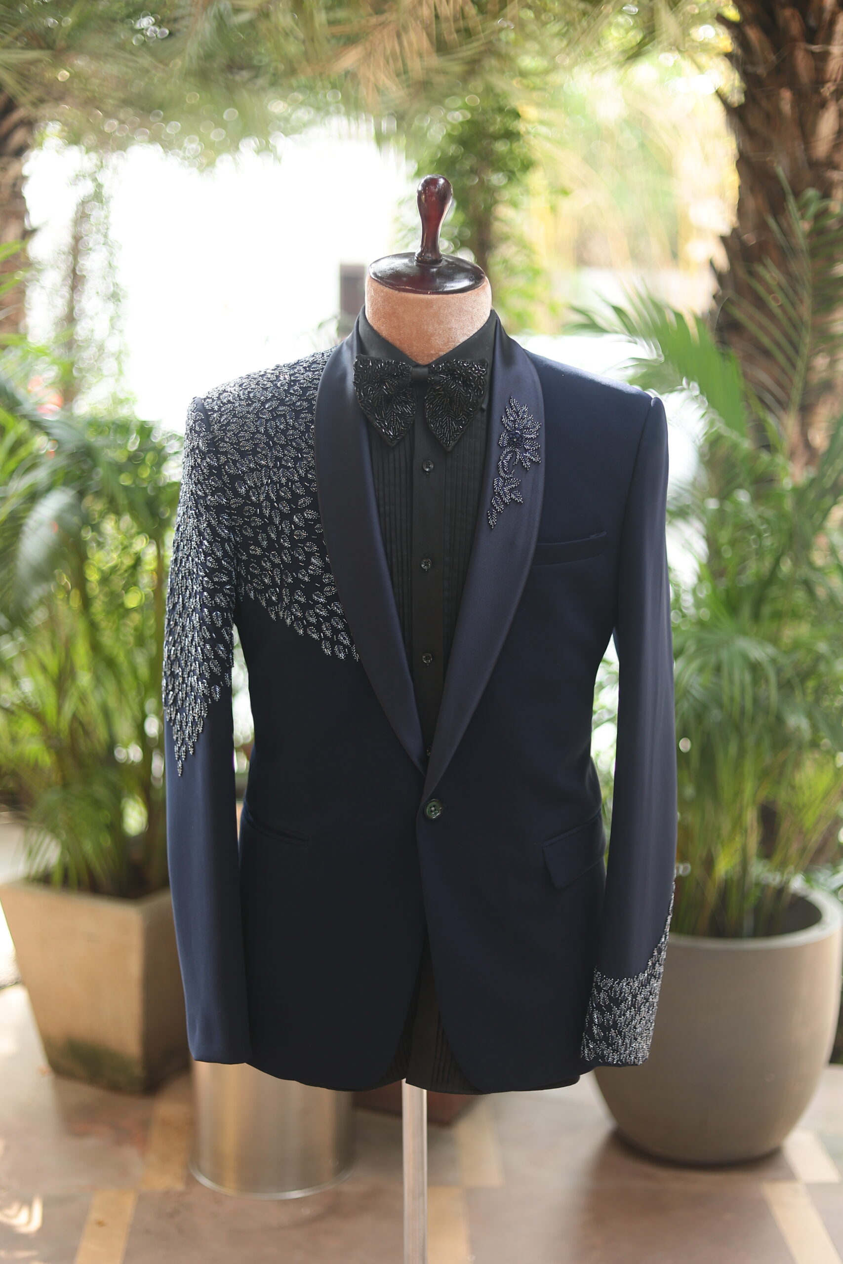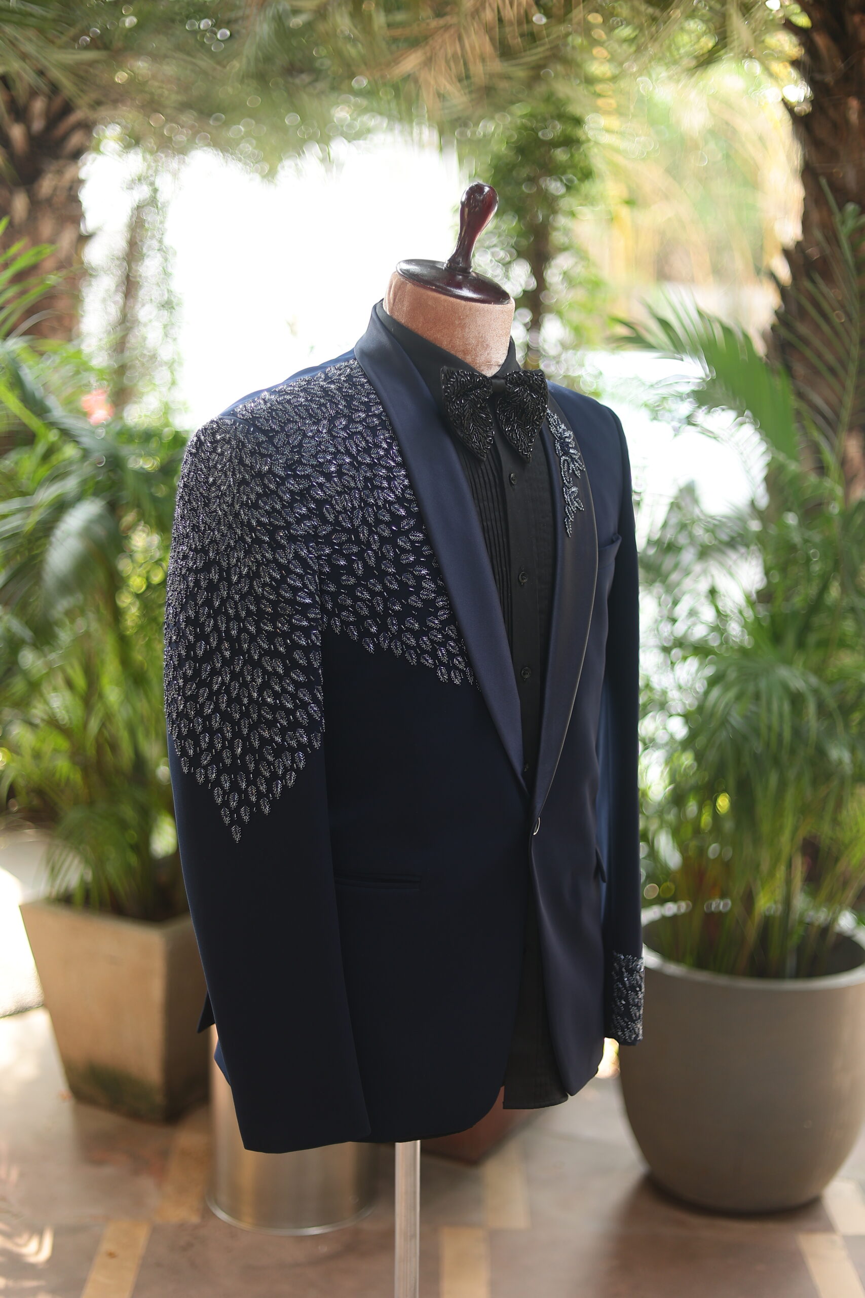 A refined midnight blue tuxedo paired with a black shirt, designed for a sharp and timeless formal look. The deep blue tone adds character while maintaining a classic appeal, making it suitable for weddings, receptions, and evening occasions.