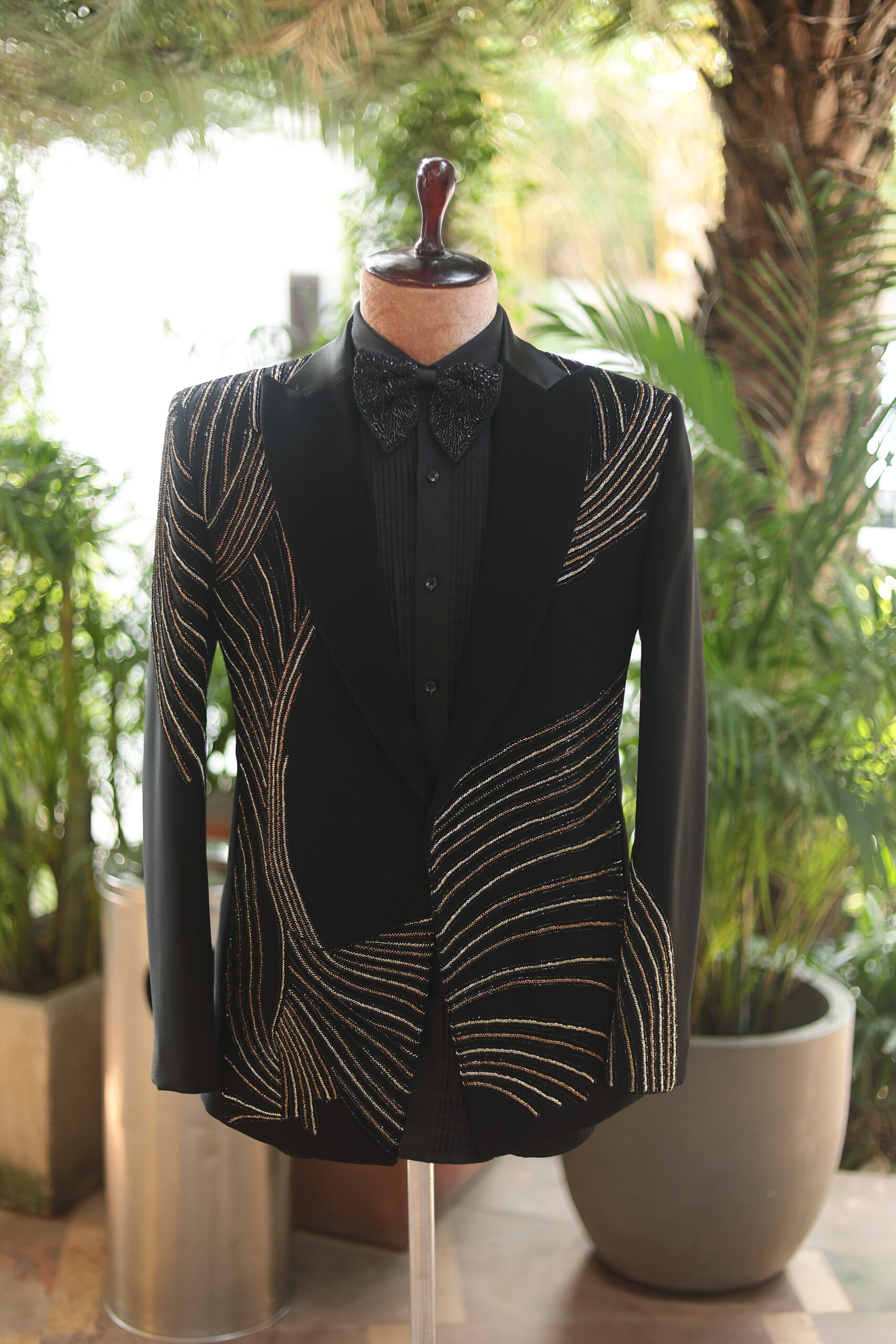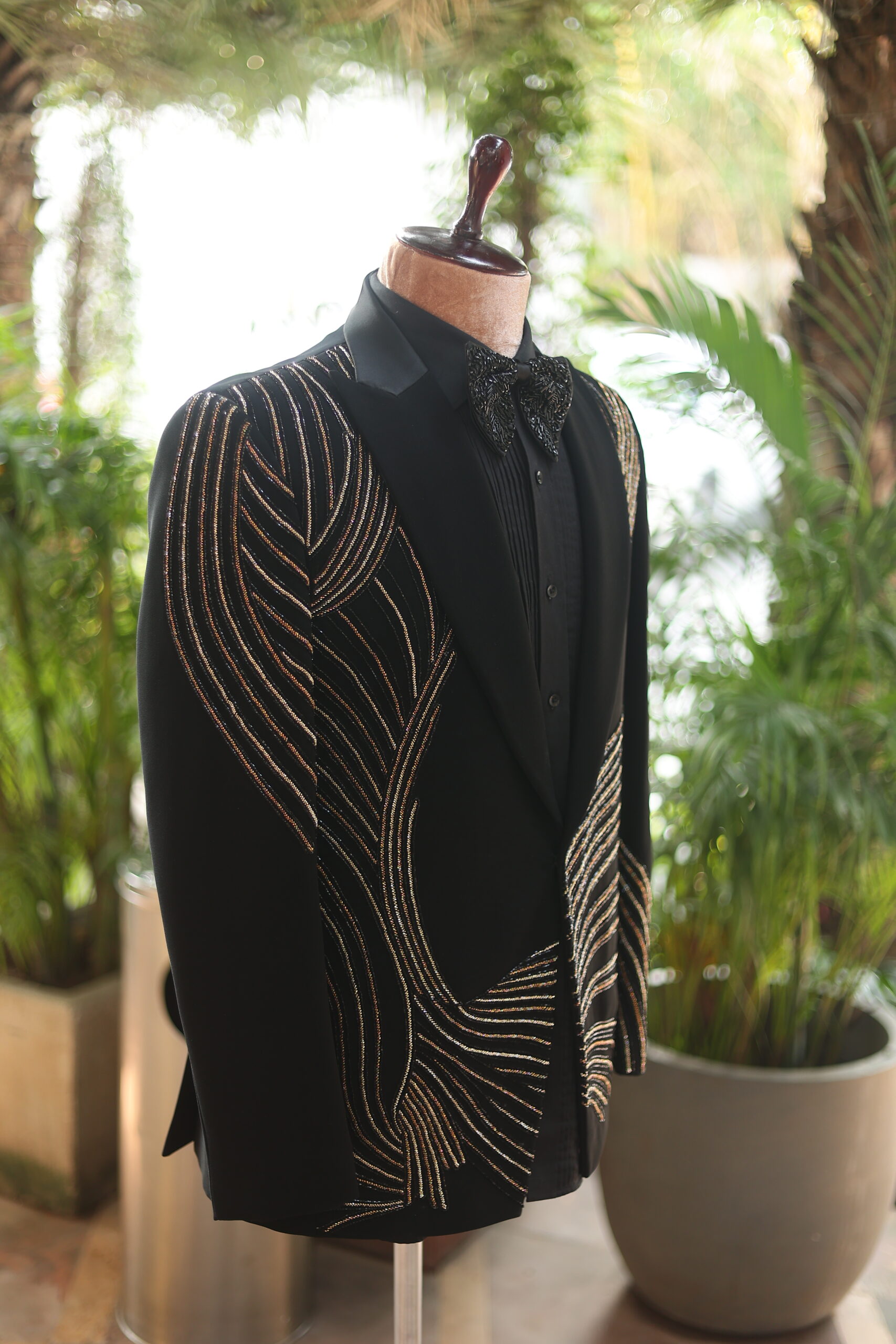 A refined black Italian crepe tuxedo detailed with elegant gold and black embroidery throughout. The fabric has a smooth finish that drapes well, while the embroidery adds depth without overpowering the look.