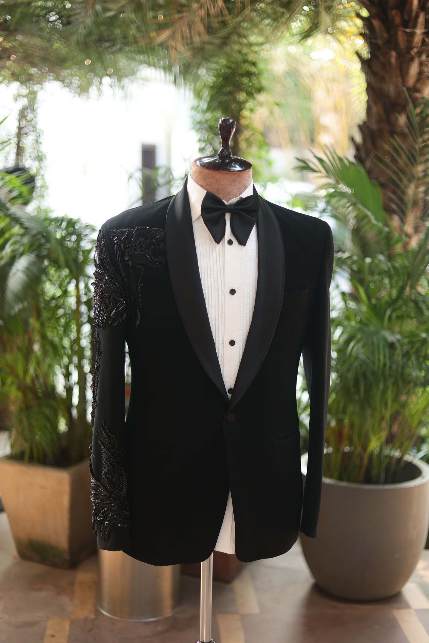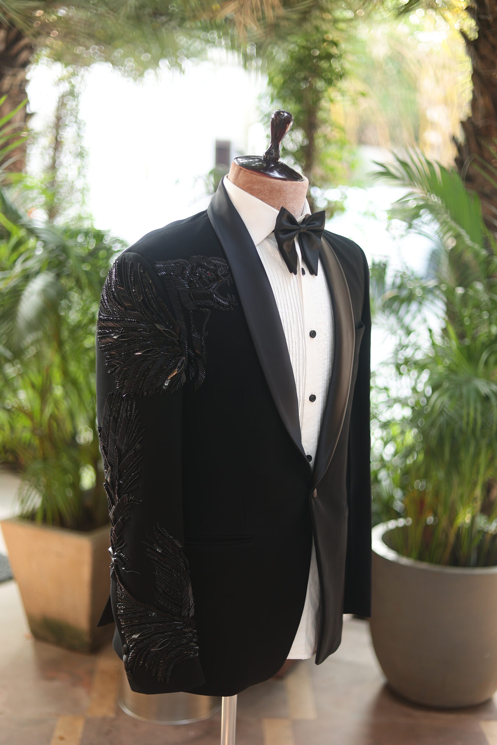 A timeless black tuxedo for men featuring black beaded work, adding subtle texture while keeping the look sleek and understated. The tonal detailing blends smoothly with the fabric, giving the outfit a refined and balanced finish.